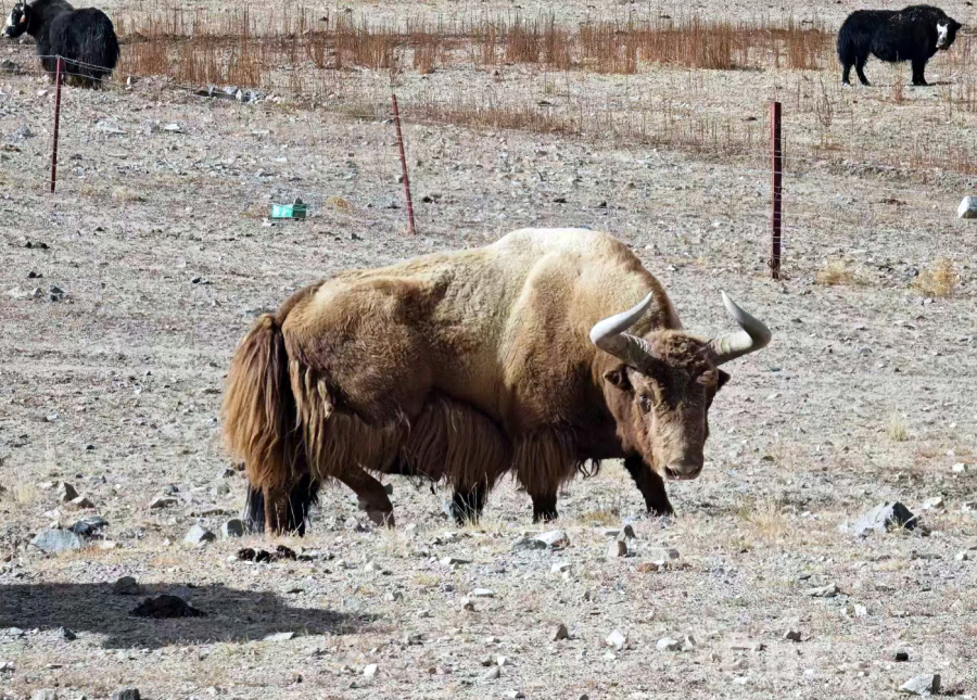 圖為羌塘國家級自然保護區的一頭金絲野牦牛與放牧的家畜牦牛和諧相處(革吉縣野保員洛洛提供)