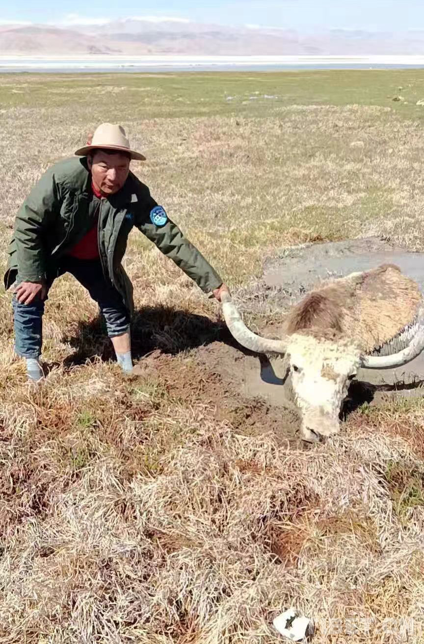 圖為西藏阿里地區革吉縣野生動物保員正準備救助一頭陷入沼澤地的金絲野牦牛(野保員洛洛提供圖片)