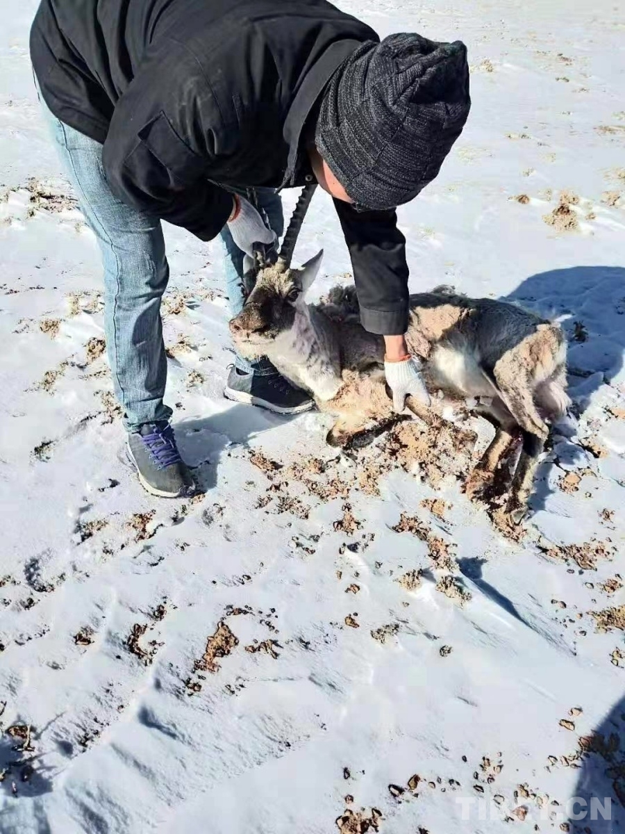 圖為西藏阿里地區革吉縣龍熱管理站野保員洛洛在雪地里正在救助一只受傷的小藏羚羊(野保員洛洛提供圖片)