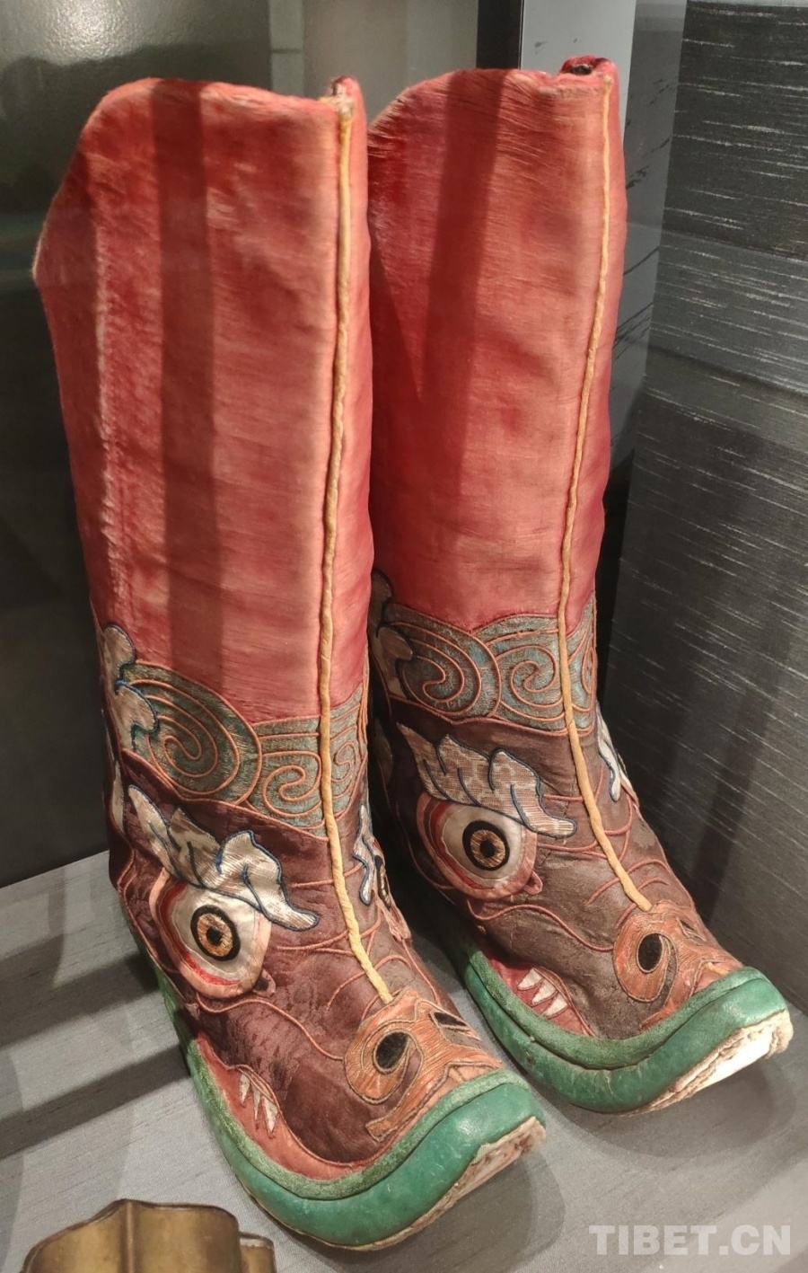 15號藏品為龍首紋藏靴,出自西藏,進入館藏時間為1905年。據博物館介紹,這雙靴子不是一般藏族百姓穿的靴子,而是降神者在降神儀式上所穿用的。這雙靴子除了具有一般藏靴的特征外,鞋面繡有龍首,代表神圣之意。靴型寬大,前頭略尖,且向上翹起,造型別有韻致。