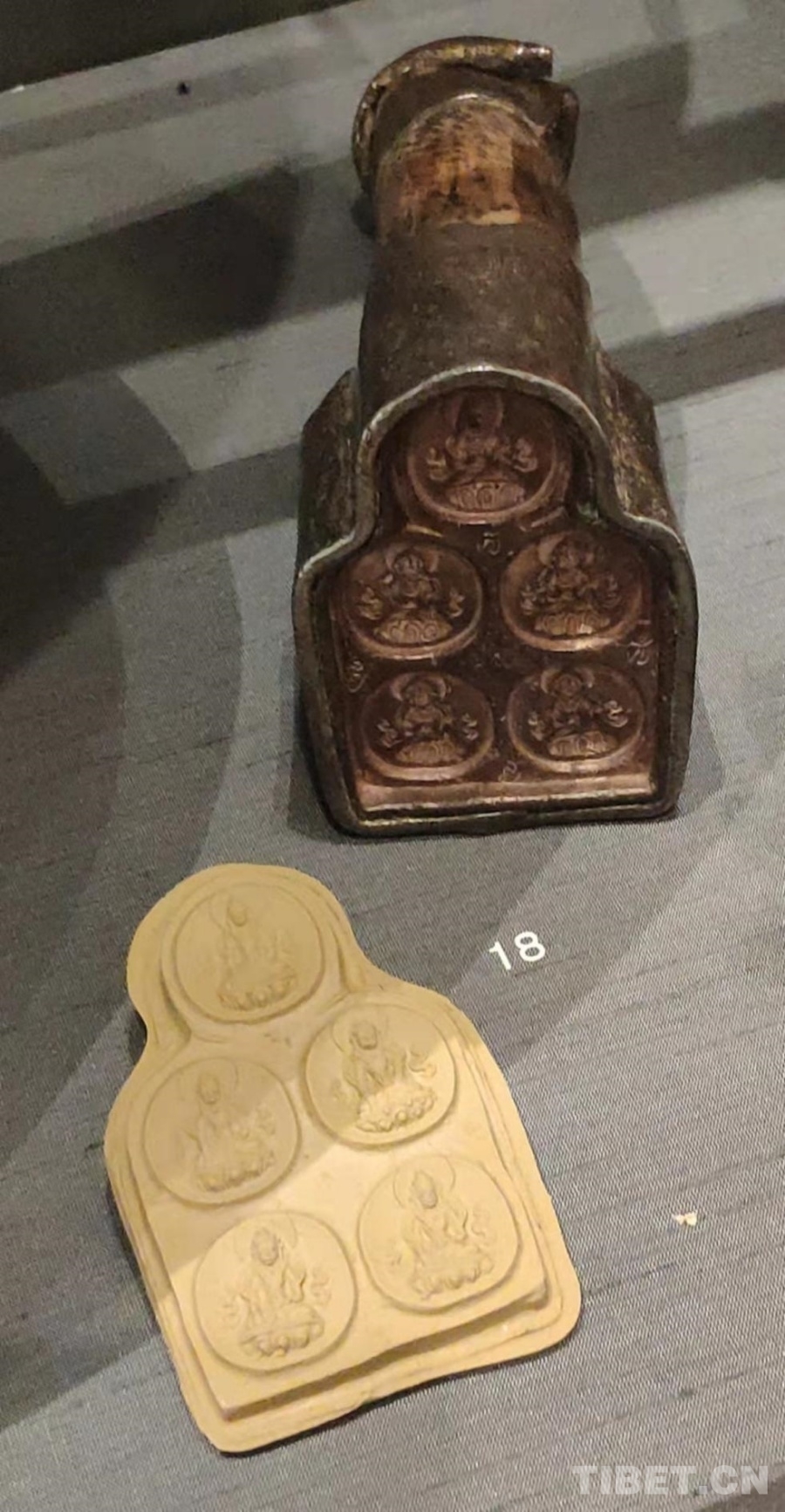 “擦擦”模具,出自西藏,模具為鐵質,手柄為木質,一模五腔,進入館藏時間為1905年。“擦擦”音譯自梵語,意思是“復制”,指一種模制的泥佛或泥塔。藏傳佛教認為,制作“擦擦”可積攢善業功德,并將其視為消災祈福的圣物。“擦擦”被普遍供奉于神山、神殿、寺廟旁,大路中央或交叉路口。還有的“擦擦”存放于大佛像的體內、佛塔中央。除以上的供奉方式外,“擦擦”還常被安放于隨身佩帶的“嘎烏”之內,充當護身符。