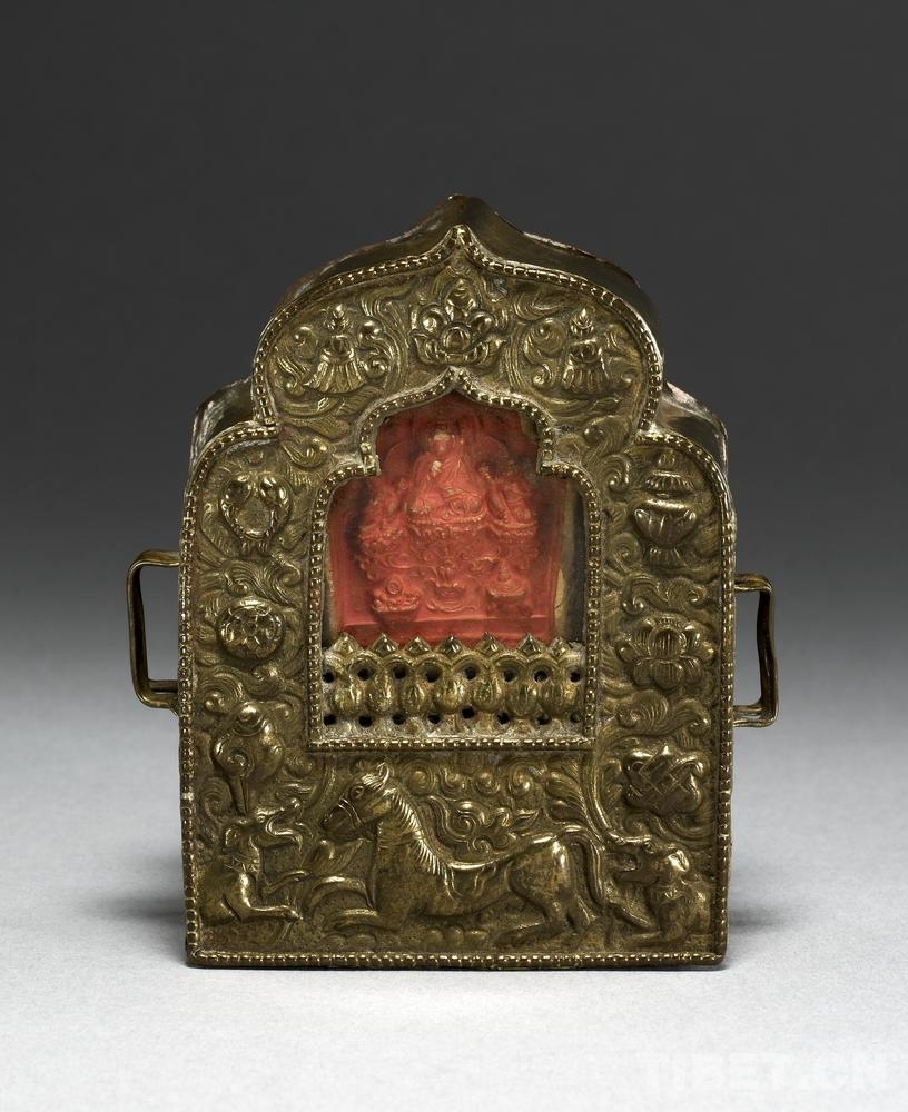 19號藏品為銅制“嘎烏”,內裝有“擦擦”和香料包,出自西藏,進入館藏時間為1905年。“嘎烏”,是藏語的音譯,指護身佛的盒子,即小型佛龕。盒子里一般裝有“擦擦”佛像、印著經文的綢片、舍利子或者甘露丸、由高僧念過經的藥丸,以及活佛的頭發、衣服的碎片等。“嘎烏”還是精美的裝飾品。其形狀不一,一般為銀質或銅質,盒面上鑲嵌有瑪瑙、綠松石,雕刻有多種花紋圖案。