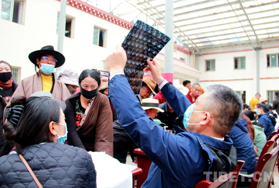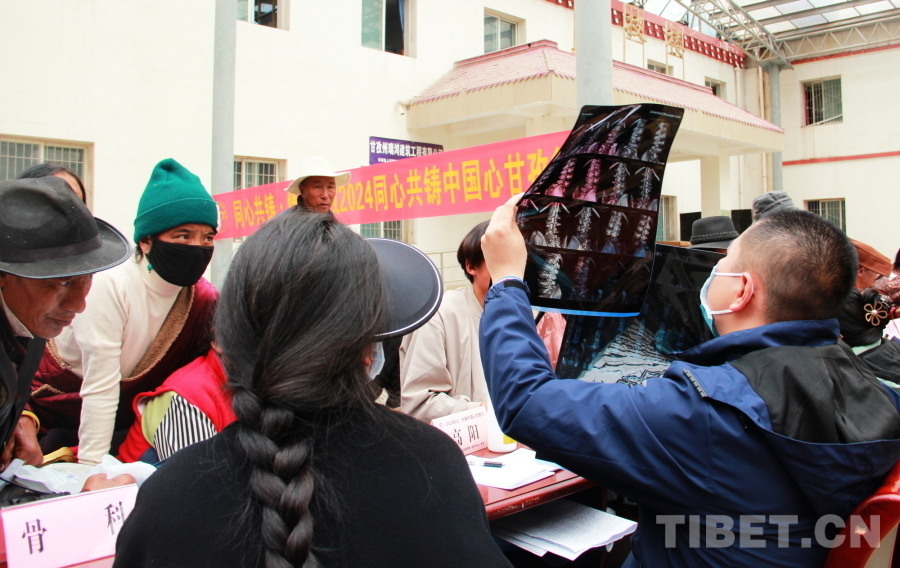 圖為2024“同心·共鑄中國心”甘孜行大型公益活動石渠縣義診現場,中國人民解放軍總醫院第一醫學中心骨科副主任醫師高陽正在查看患者帶來的片子 攝影:劉莉