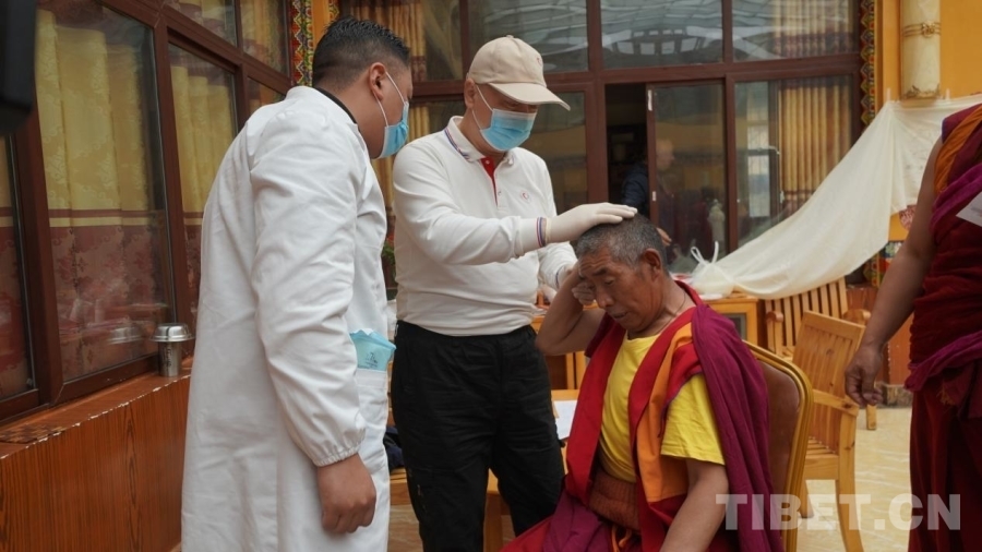 中國西藏網訊 7月10日,“同心·共鑄中國心”公益醫療團隊走進四川省甘孜藏族自治州理塘縣長青春科爾寺(又名理塘寺),為寺內僧人義診?,F場義診的專家們平均年齡都在四十歲以上,他們都是一邊與高原反應抗衡一邊堅持義診,秉承著“缺氧不能缺精神”的態度堅持工作。