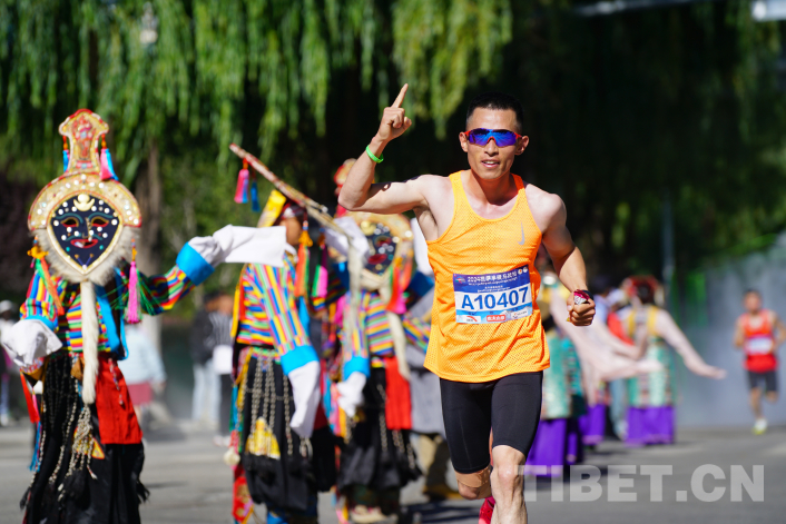 圖為 2024拉薩半程馬拉松18公里處參賽選手途經拉魯濕地國家級自然保護區,拉薩市城關區藏戲藝術團以藏戲的形式為選手加油助威 攝影:趙振宇