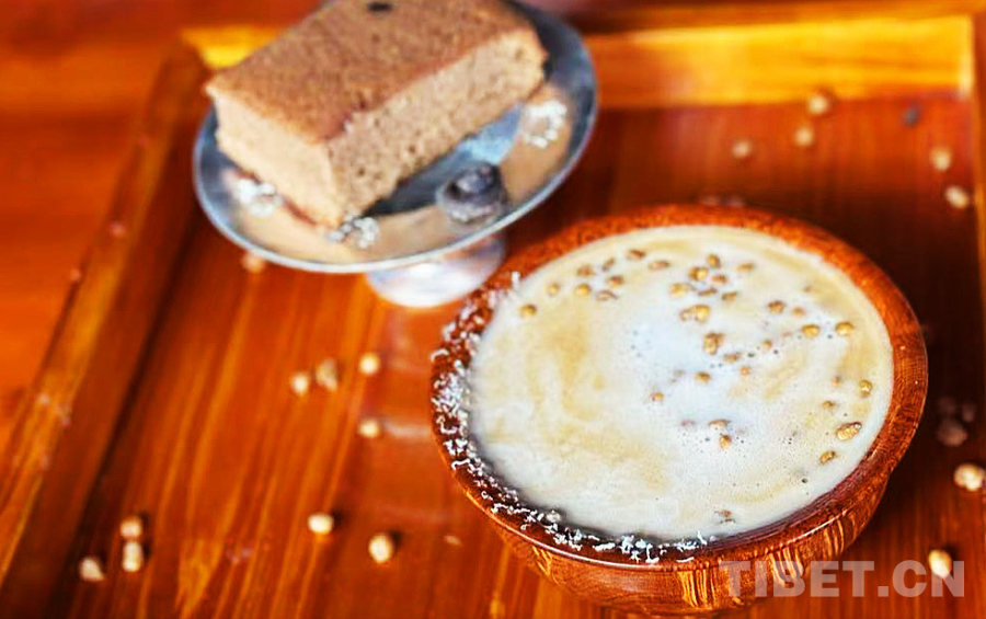 在濃郁的咖啡液里注入青稞奶,撒上當地產的酸酸的奶渣和青稞粒——一碗香濃的咖啡完成了。是的,是“一碗咖啡”,索朗群培專門選用了藏族群眾喜愛的傳統木碗用作咖啡杯。