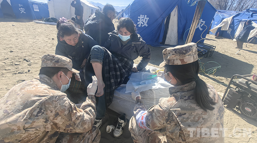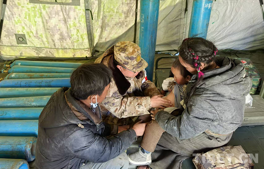 圖為西藏軍區總醫院救援隊醫護人員到安置點帳篷進行巡診