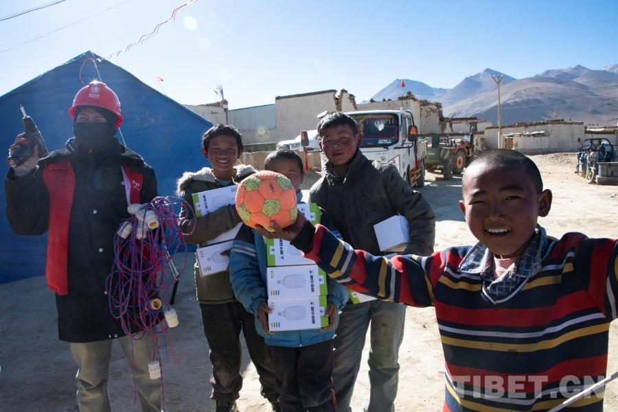 “來,你們拿著這些燈泡跟著我!”在次仁旦增和其他兩位組員的組織下,小男孩們化身為措昂村受災安置點的小小志愿者,簇擁著從這些從山南前來支援的國家電網工作人員走進一間間帳篷,為站在高處正在架設電線的叔叔們遞上工具和燈泡。