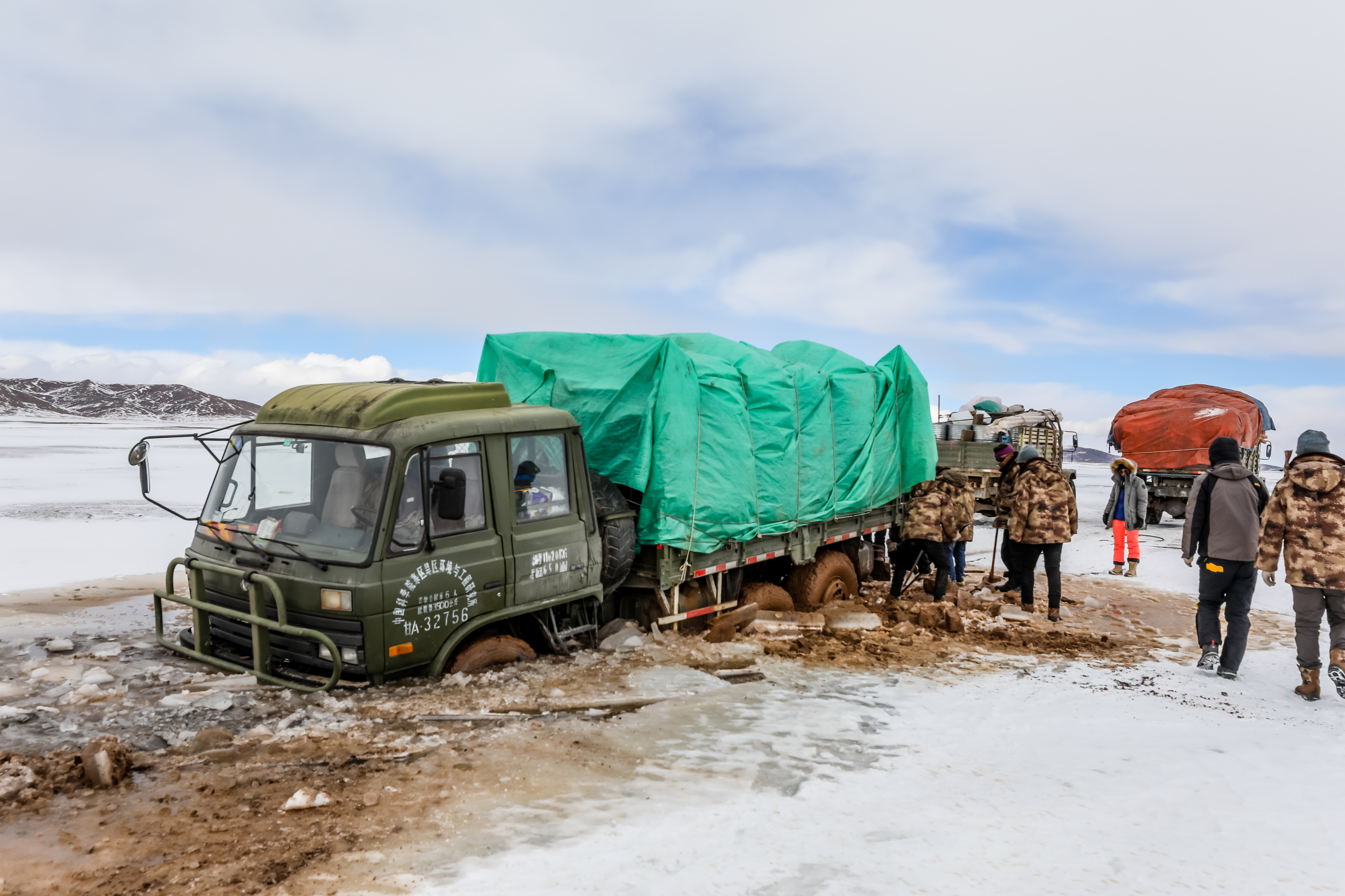 最后一次陷車臨近山的埡口,大雪掩蓋了尚未冰封凍實的小池塘。小型越野車通過后,大卡車順著車轍前行,深陷池塘。此時天已擦黑,狂風呼嘯,科研人員只好把卡車上4噸的物品全部卸下,將車拖出,再進行裝車。“零下十幾攝氏度,5級風的情況下,我們在那里折騰了4個小時。”