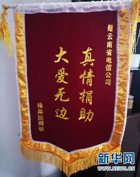 2019年9月,格桑拉姆將書有“真情捐助 大愛無邊”字樣的錦旗,送到前來燕門鄉調研的中國電信云南公司黨委書記、總經理王宏手上,以表達自己的感激之情。