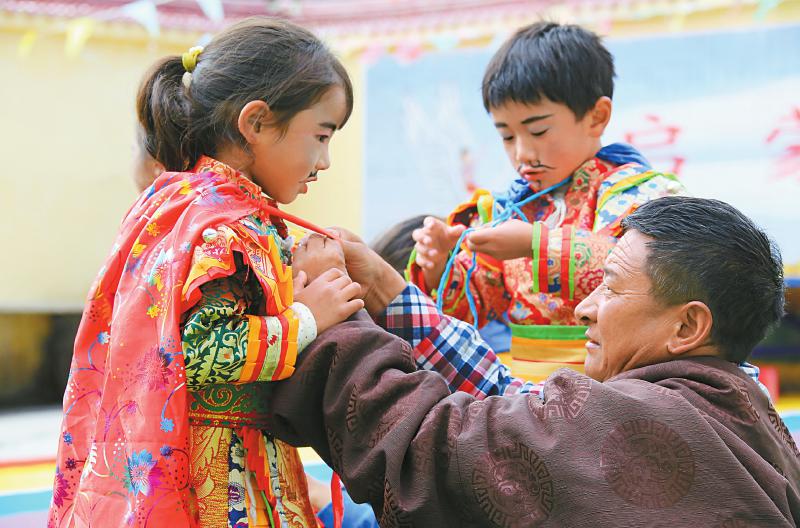 壤塘非遺傳承人為巴生村幼兒園學生穿上藏戲服裝,準備表演藏戲《賽馬稱王》。易西 攝