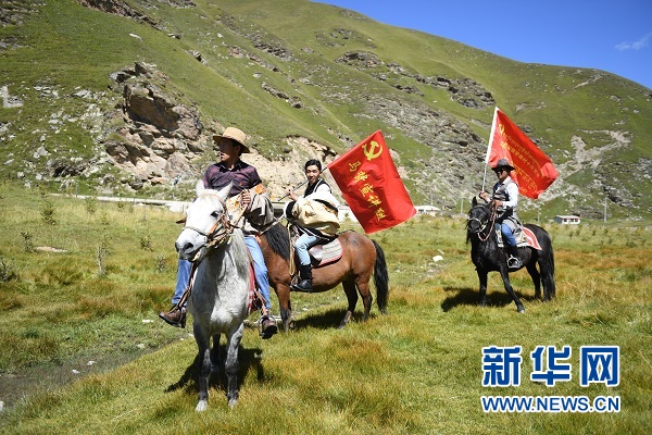 瑪沁縣拉加鎮贊根村的“馬背宣傳隊”。新華網 潘彬彬 攝