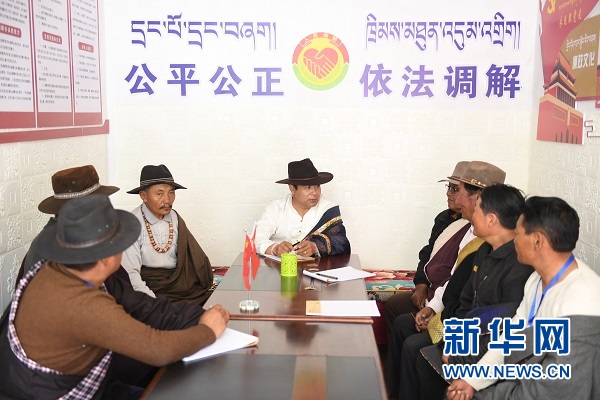 “官卻個人調解工作室”(中為官卻)為當地群眾調解矛盾糾紛。新華網 潘彬彬 攝