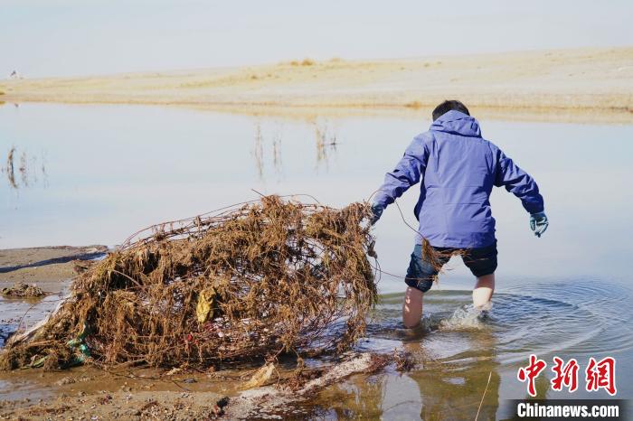 寒風凜冽,湖水冰涼,寒徹入骨。十月中旬的青海湖湖濱地區最低氣溫達零下二攝氏度,部分河流開始結冰,青海湖牧民巡護隊隊員尖木措卷起褲腿,邁入冰冷的湖水,徒手將陷入淤泥中的廢棄鐵絲拉上岸。幾分鐘后,尖木措裸露在外的小腿早已凍得通紅。