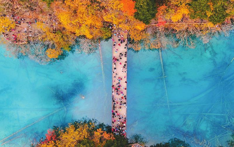 各地游客走進九寨溝景區游覽。蘇楊 攝