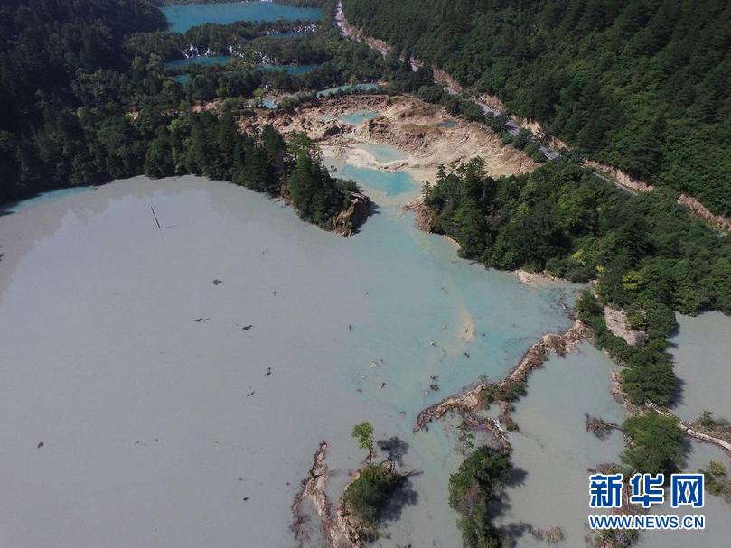這是2017年九寨溝遭遇地震后的火花海景點(2017年8月9日攝,無人機照片)。新華社發
