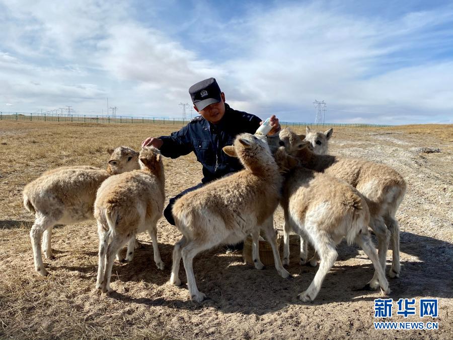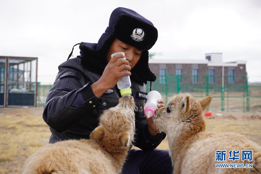 可可西里巡山隊員鄧海平給藏羚羊幼仔喂奶(12月6日攝)。新華社記者 藍翔 攝
