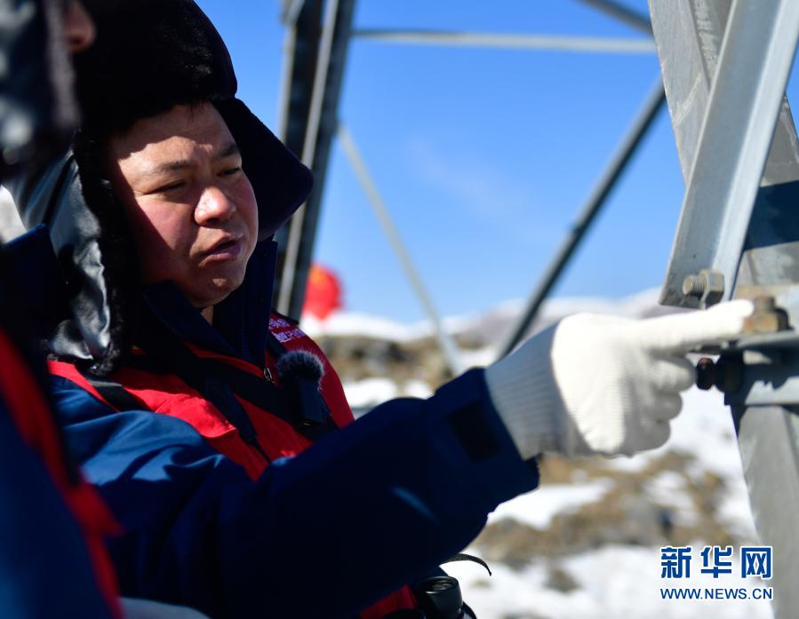 1月21日,國家電網西寧供電公司輸電運檢中心運檢人員董進軍在測量線路耐張線夾溫度。新華社記者 張龍 攝