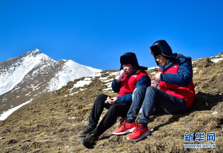 1月21日,國家電網西寧供電公司輸電運檢中心運檢人員在巡檢途中吃午飯。新華社記者 張龍 攝