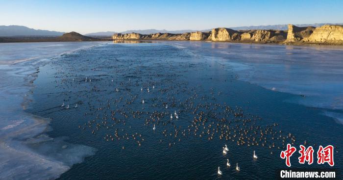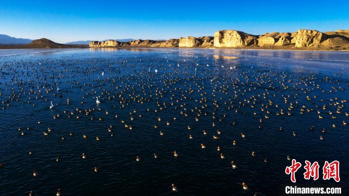 圖為上萬只野生鳥類在湖中游蕩。烏席勒 攝