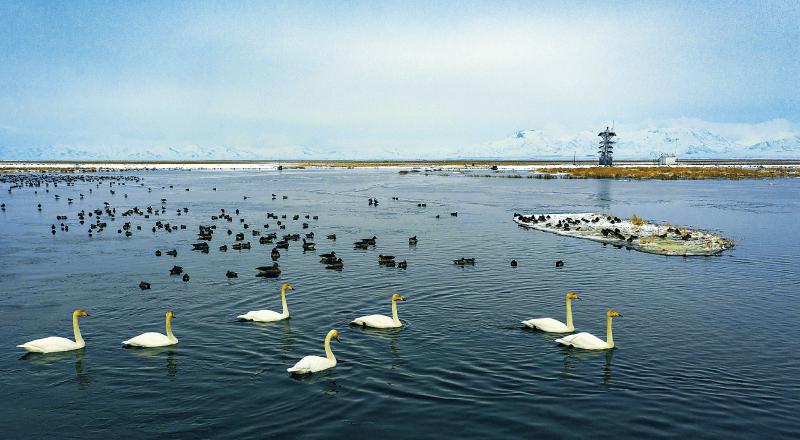 3月6日清晨,雪后陽光下,數千只黃鴨、赤麻鴨、藏鴛鴦、棕頭鷗、斑頭雁等飛禽在光影交錯的四川省阿壩藏族羌族自治州若爾蓋花湖嬉戲翱翔,為初春的高原濕地平添靈動與生機。在草原濕地深處,一群剛剛從云貴高原“度假”歸來的國家一級保護動物黑頸鶴正漫步水草間悠然覓食。不遠處,新年前后成群歸來的大天鵝早已開始享受若爾蓋縣麥溪鄉終年不凍濕地帶來的豐茂食物。