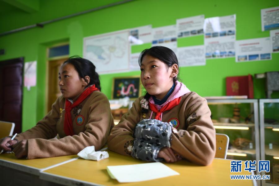 3月23日,吉尕小學學生達葉(右)在生態課堂上。新華社記者 張宏祥 攝