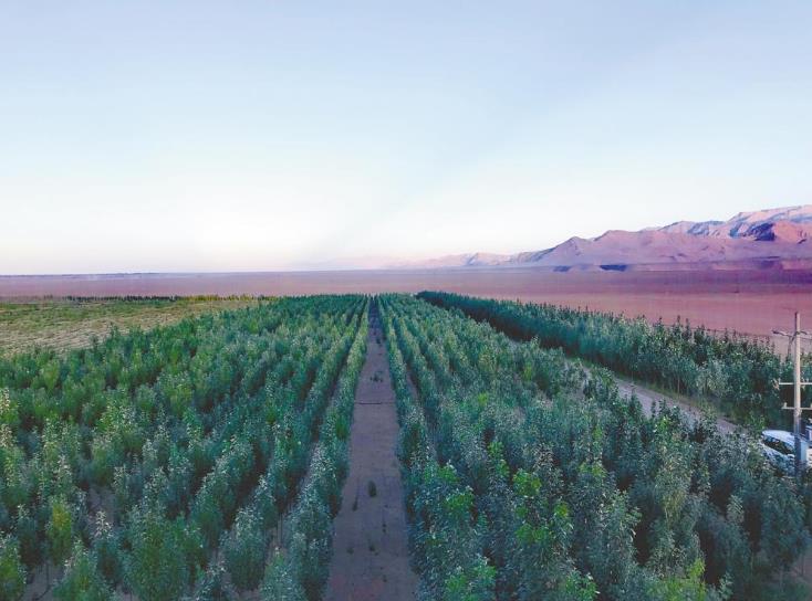 跟隨柴達木防沙治沙公司員工深一腳、淺一腳地走在治沙基地田埂上,一排排在田間地頭栽植的林木,為農田和枸杞林構成了一道道擋風墻。雖然眼下林木尚在發芽,到了夏秋時節就是滿目蔥郁。