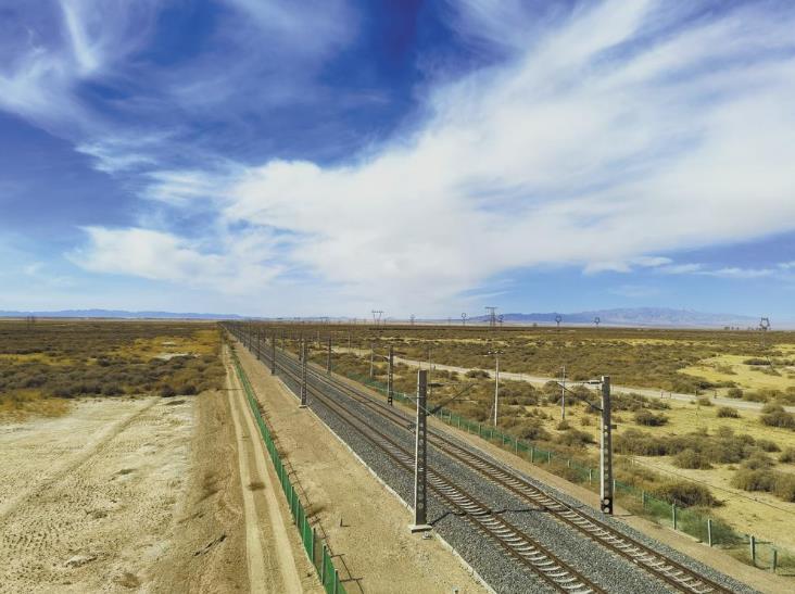 鐵路兩旁的綠化帶一直向戈壁內延伸。劉法營 攝