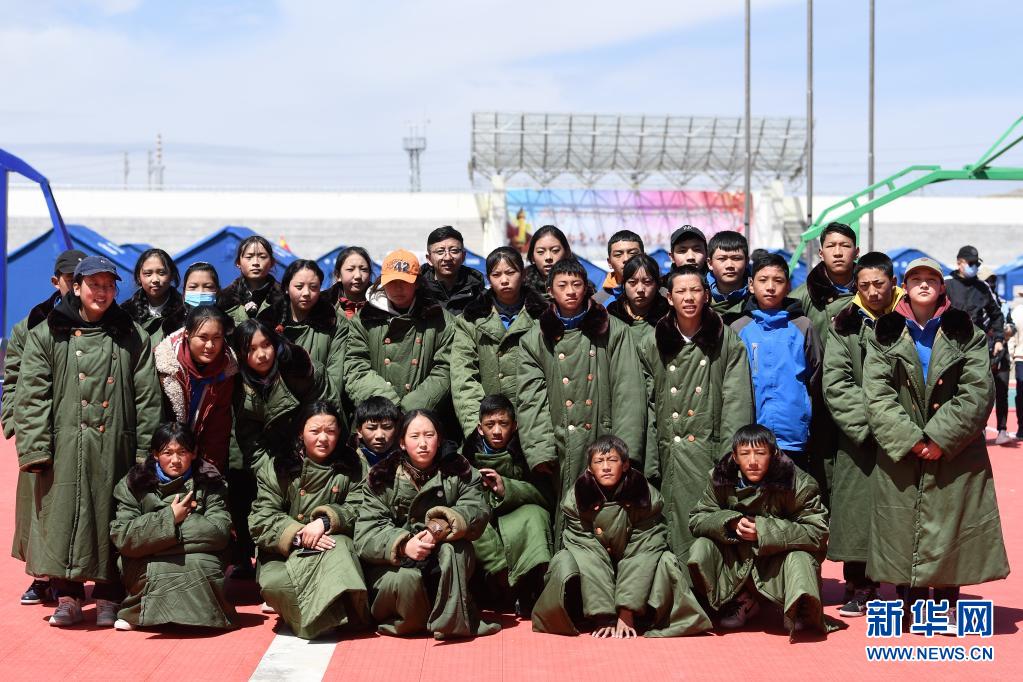 5月24日,瑪多縣民族寄宿制中學的師生們參加升旗儀式。當日,青海省果洛藏族自治州瑪多縣學生復課。(無人機照片) 中新社記者 馬銘言 攝
