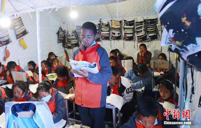 24日,青海瑪多7.4級地震后的第三天,全縣受災的5所中小學、1906名學生全部在安置帳篷中正常上課。