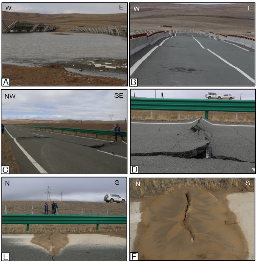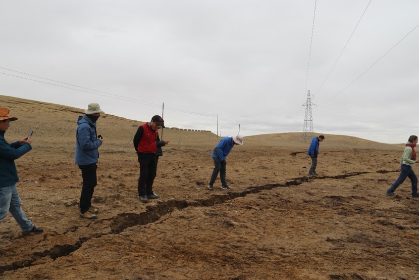 應急考察隊相關負責人介紹,考察隊在白瑪納村附近發現地震次生破裂多處,黃河鄉附近向北西二十多公里地表破壞較為嚴重,破裂帶整體走向近120度,沿線隨處可見張裂隙、砂土液化等現象,路旁電線桿傾斜嚴重。接近G214國道一處地表破裂切過公路形成最大左行位錯量。根據野外現象觀察,斷裂具有左行走滑兼正斷的運動學特性。