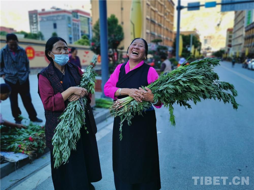 圖為藏族婦女懷抱剛買的菖蒲、艾葉