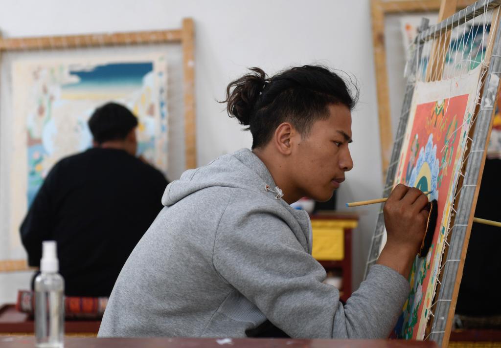 6月17日,在青海民族大學藝術學院,工藝美術(唐卡)專業學生在繪制唐卡。新華社記者 張龍 攝