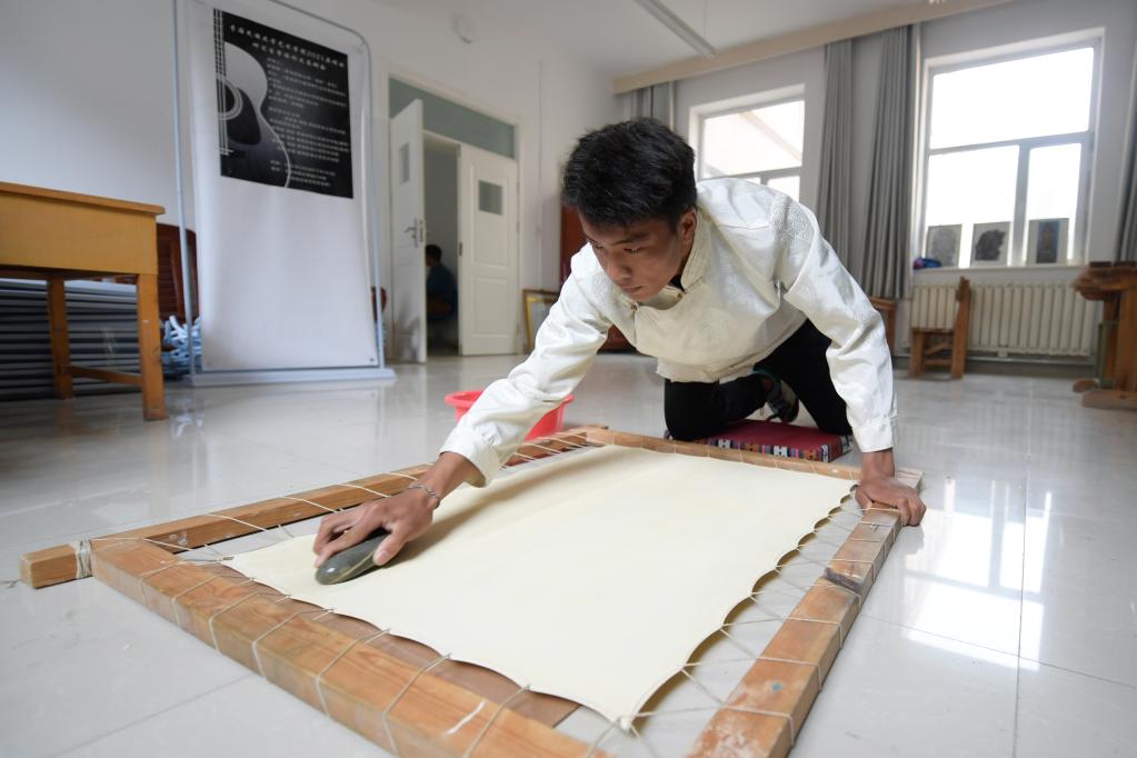 6月17日,在青海民族大學藝術學院,工藝美術(唐卡)專業學生在制作唐卡畫布。新華社記者 張龍 攝