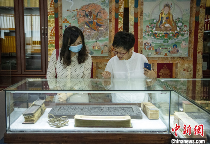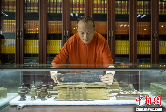 7月8日,四川成都,喜馬拉雅文庫(kù)總編輯才讓多吉在《格薩爾》資料中心整理館藏經(jīng)書。中新社記者 劉忠俊 攝