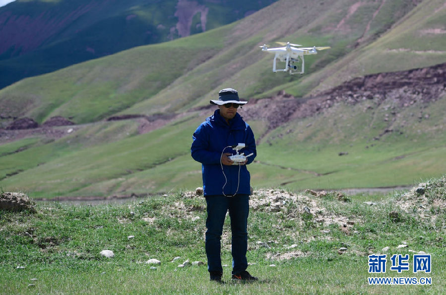 2021年長江源綜合科考的科考隊員趙保成在使用無人機觀測長江源地區生態環境(7月24日攝)。新華社記者 張龍 攝
