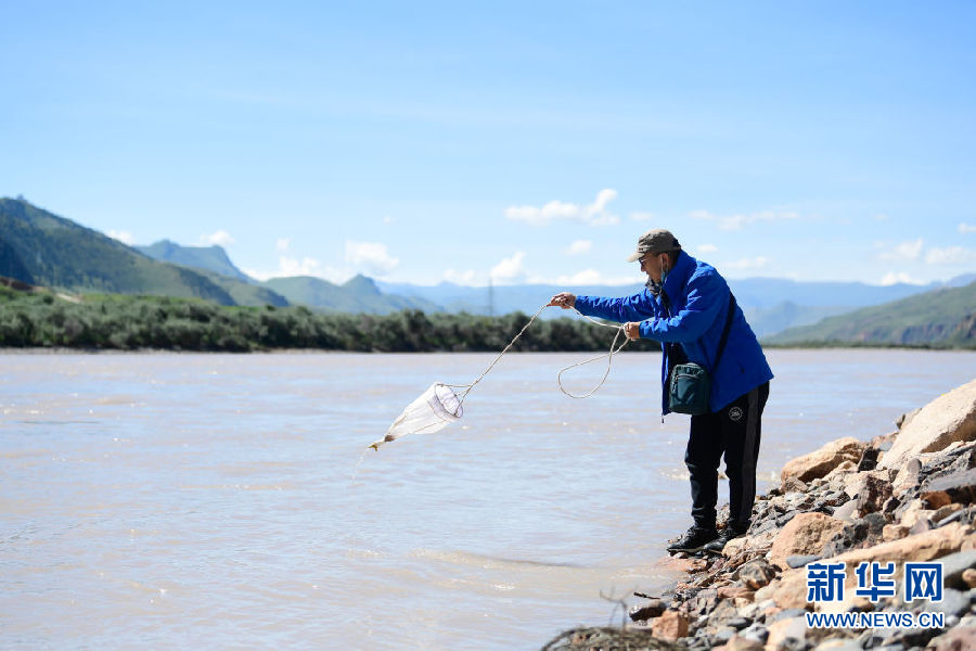 2021年長江源綜合科考的科考隊員陳鵬在通天河流域觀測河流流速(7月24日攝)。新華社記者 張龍 攝