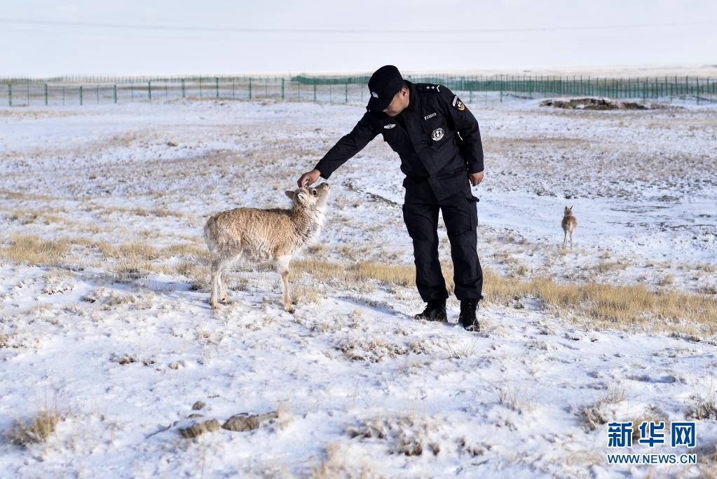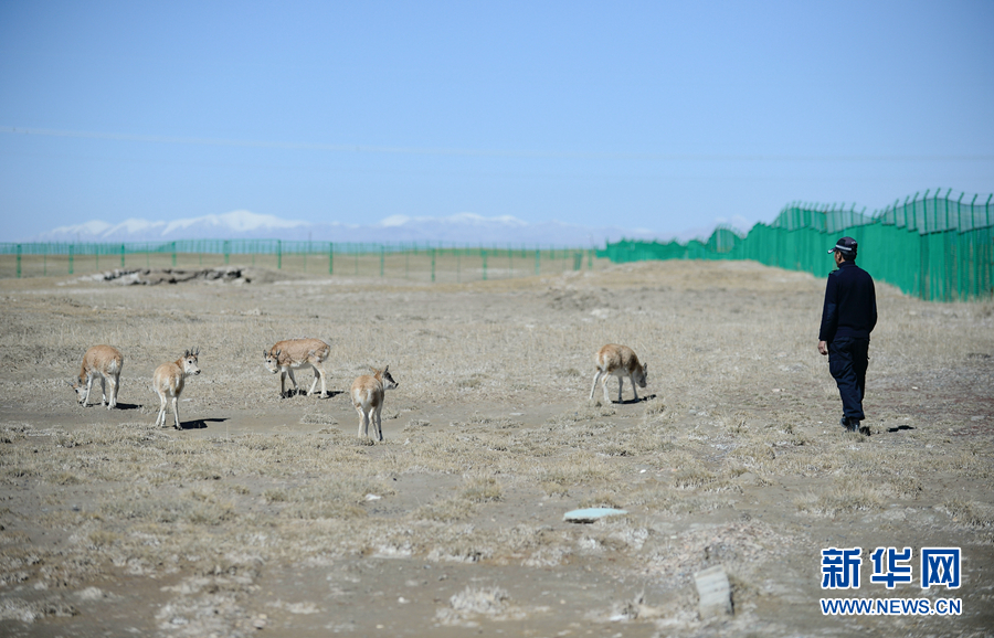 在可可西里國(guó)家級(jí)自然保護(hù)區(qū)索南達(dá)杰保護(hù)站,站長(zhǎng)趙新錄與藏羚羊在一起(9月28日攝)。新華社記者 李占軼 攝