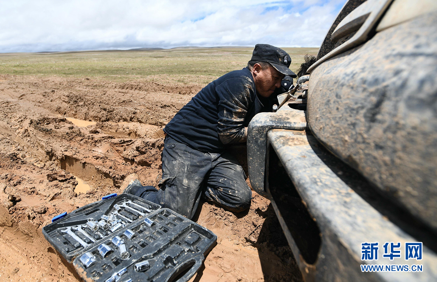可可西里國(guó)家級(jí)自然保護(hù)區(qū)卓乃湖保護(hù)站站長(zhǎng)秋培扎西在可可西里地區(qū)修理車輛(2020年7月6日攝)。新華社記者 薛玉斌 攝