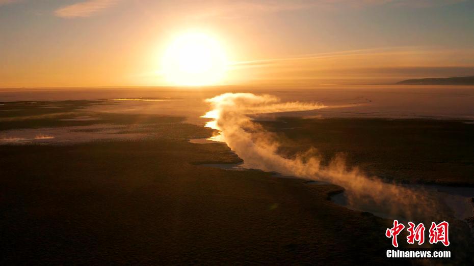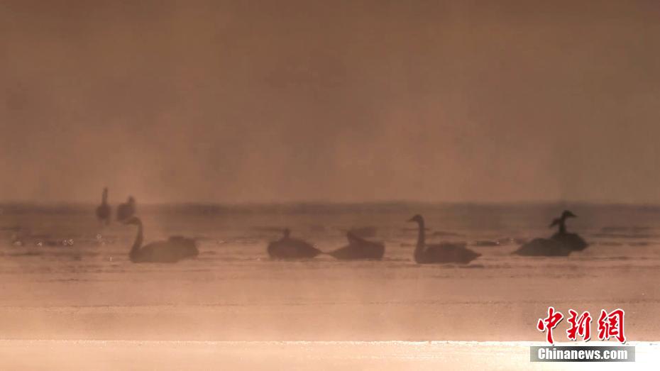 在冬日晨曦,初升的暖陽(yáng)下黑馬河水汽升騰,成群的大天鵝宛如仙子沐浴出水,畫(huà)面唯美。馬海青 攝