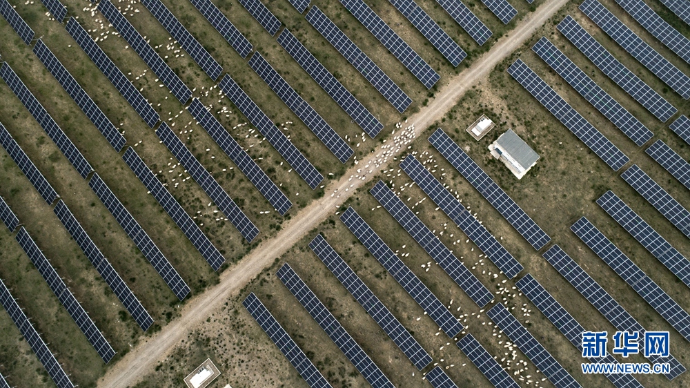 羊群在青海省海南藏族自治州共和光伏產業園吃草(無人機照片)。新華社記者 吳剛 攝