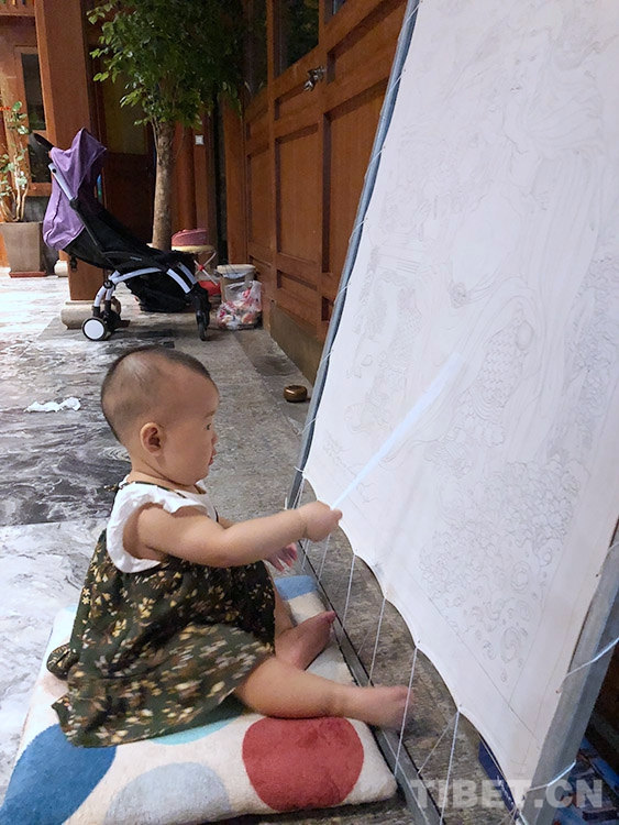 仁青多杰自己也有兩個(gè)女兒,大女兒已經(jīng)快五歲了,受家庭環(huán)境熏陶,從會(huì)走路時(shí)起,就喜歡拿毛筆,也非常喜歡畫畫。仁青多杰和父親每天都在畫畫,有一次在北京,仁青多杰的一幅唐卡快要完成了,女兒趁著中午大人們吃飯的間歇,跑出去拿著毛筆和顏料自己畫。那幅畫仁青多杰一直保留在北京,準(zhǔn)備等女兒長(zhǎng)大后送給她。