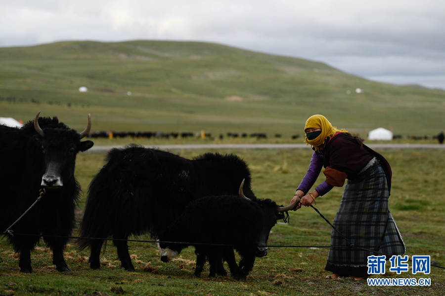 在果洛州瑪沁縣當洛鄉貢龍村的夏季草場上,牧民在拴牦牛。(資料圖)新華社記者 張龍 攝