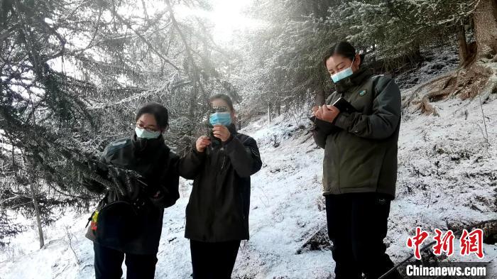 3月17日,位于祁連山腹地的青海省海北藏族自治州祁連縣,女子管護隊員們巡山察看樹木是否有病蟲害。 中新社記者 馬銘言 攝