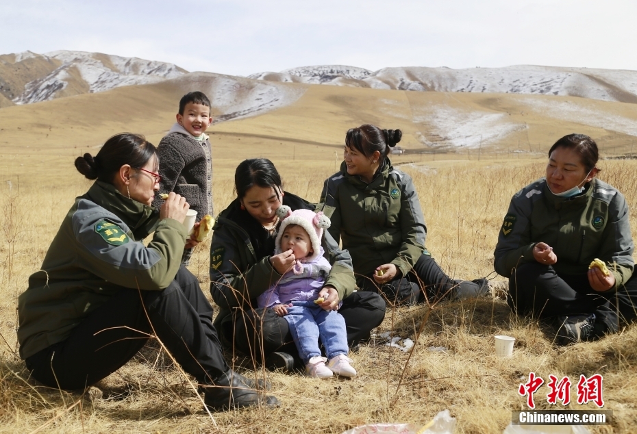 3月17日,位于祁連山腹地的青海省海北藏族自治州祁連縣,女子管護隊員們帶著孩子在草場上休息。因丈夫外出務工,女子管護隊員將沒有到入學年齡的孩子帶在身邊工作。 中新社記者 馬銘言 攝