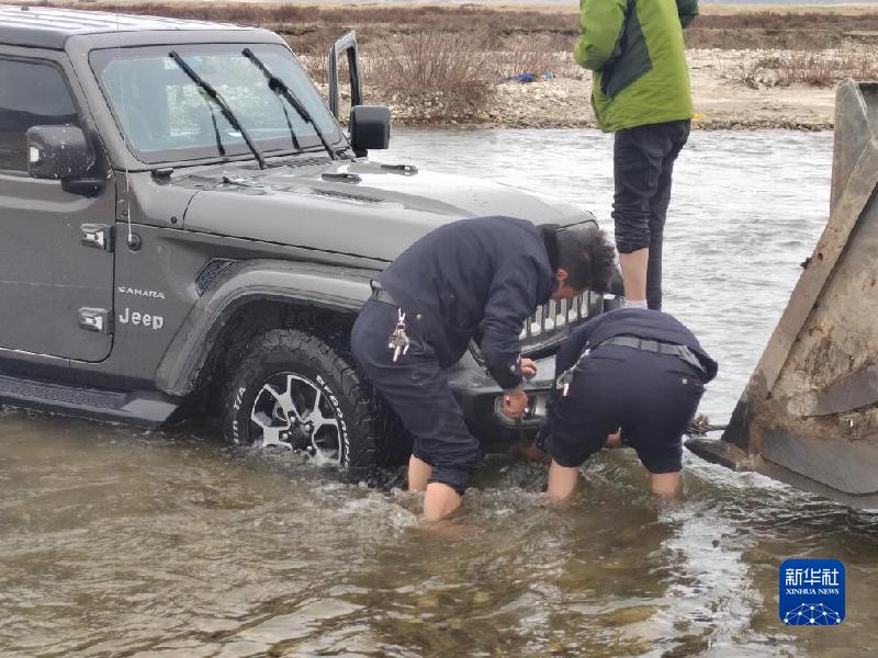 調(diào)來一輛挖掘機后,伍金曲批和輔警四郎曲扎卷起褲腿,脫下鞋子就踏進冰冷的河水中,一步步淌到越野車邊,并將拖車繩索穿到越野車拖車鉤上。