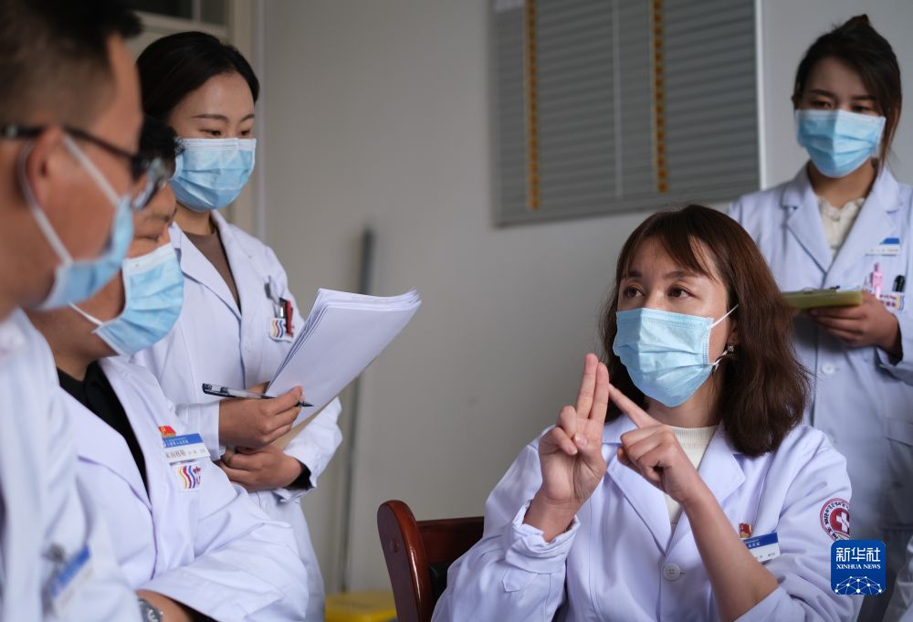 青海省人民醫院醫生、青南支醫隊員謝延玲(右二)和玉樹藏族自治州人民醫院醫生探討患者病情。新華社記者 央秀達珍 攝