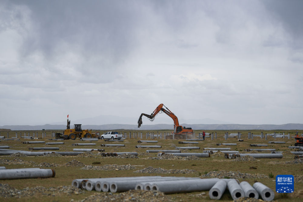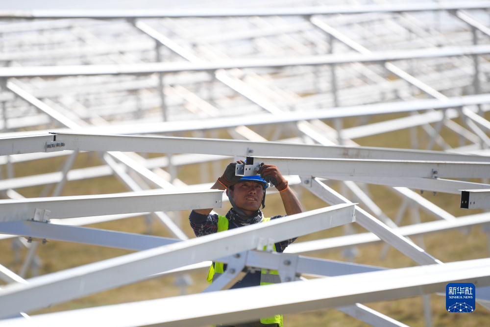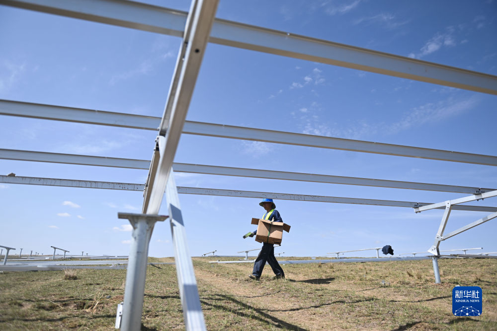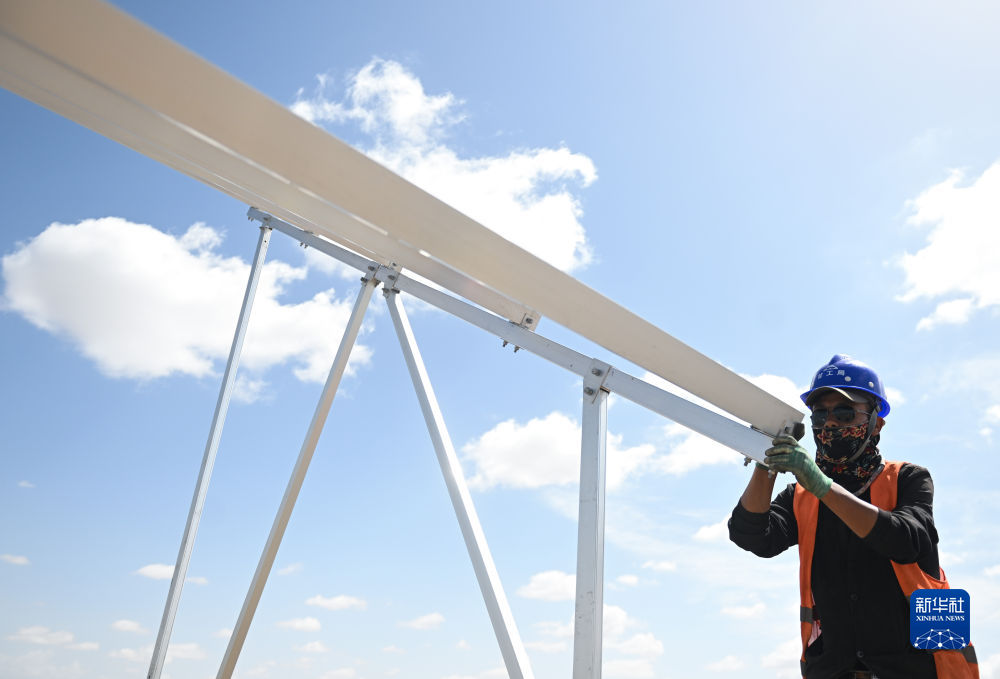 6月8日,工人在國家能源集團(tuán)海南基地共和縣100萬千瓦牧光儲(chǔ)二期20萬千瓦建設(shè)項(xiàng)目施工。新華社記者 張龍 攝