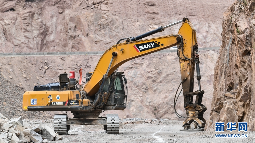 一名工作人員在瑪爾擋水電站大壩施工現場指揮推土機作業。