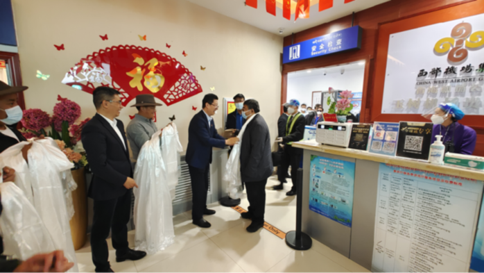 玉樹(shù)州委常委、副州長(zhǎng)、指揮部黨委書(shū)記、指揮袁浩宗,州委常委、組織部長(zhǎng)薛亞軍,州委組織部常務(wù)副部長(zhǎng)陳有軍,副部長(zhǎng)邴巴扎西,副部長(zhǎng)、指揮部黨委委員王家兵在機(jī)場(chǎng)大廳迎接,并第一時(shí)間為北京市第五批援青干部人才及送行團(tuán)成員獻(xiàn)上了飽含玉樹(shù)各族各界干部群眾深情厚誼的哈達(dá),與他們一一握手,向大家的到來(lái)表示熱烈的歡迎。